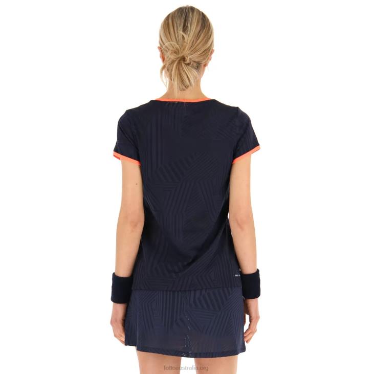 Lotto women's blue padel t-shirt with orange details. Superrapida is the Lotto specific apparel line dedicated to all Padel players, from amateurs to professionals. Characterized by style and functionality of the garments that stand out for this new emerging sport. The textured polyester fabrics ensures you a technical and dynamic look together with the contrasted losanga and details on neck, side and sleeves, to dominate in game and style. The line is available for man and woman with the same colour palette and it's paired with the dedicated footwear: match your outfits!